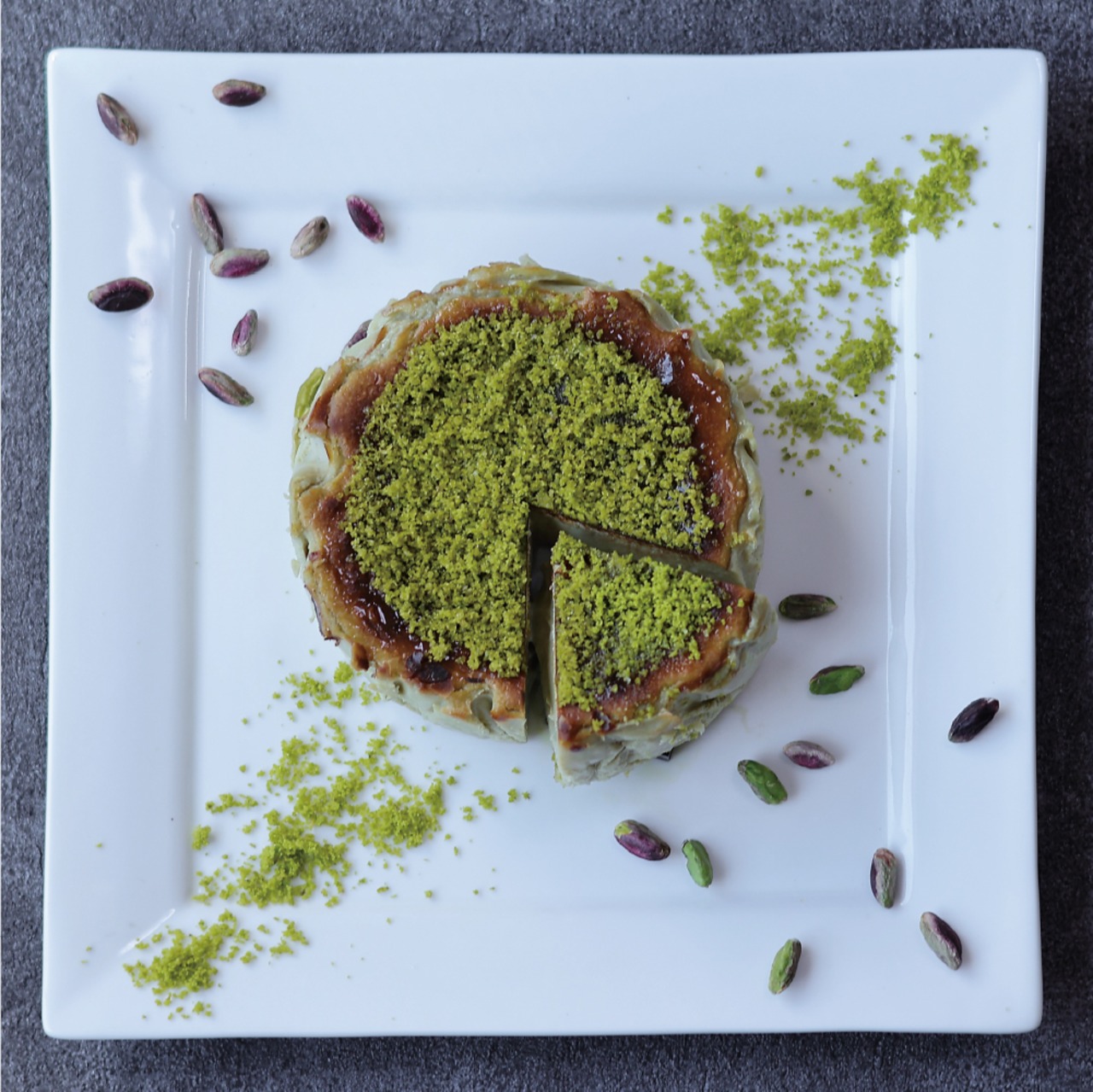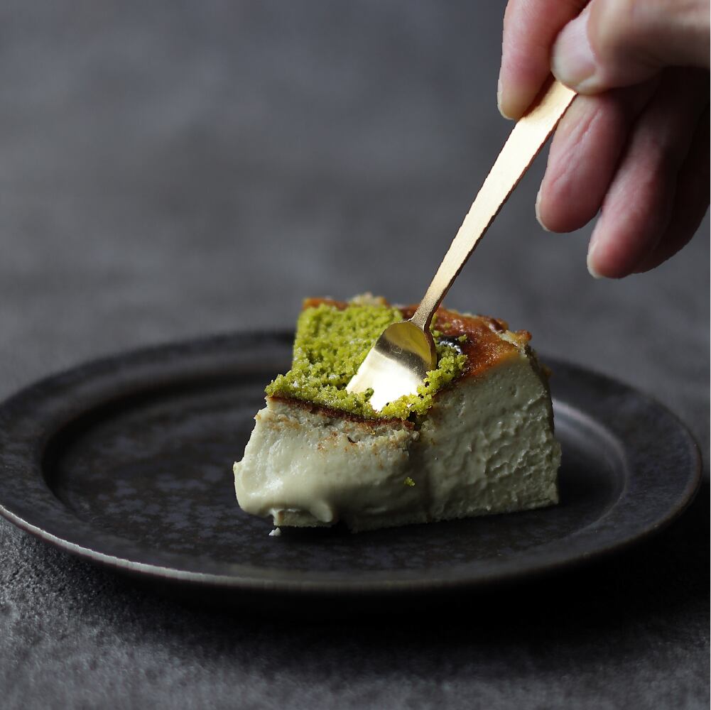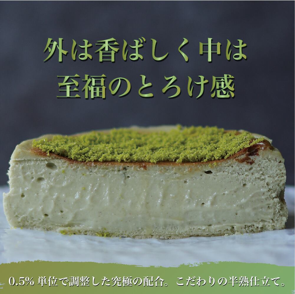 <small>0.5%単位の配合と秒単位の焼き時間により、濃厚な米国産クリームチーズとピスタチオの黄金バランスを実現。表面は香ばしく、中はとろける半熟食感に仕上げることで、口に含んだ瞬間、華やかな風味が完璧なバランスで広がります。