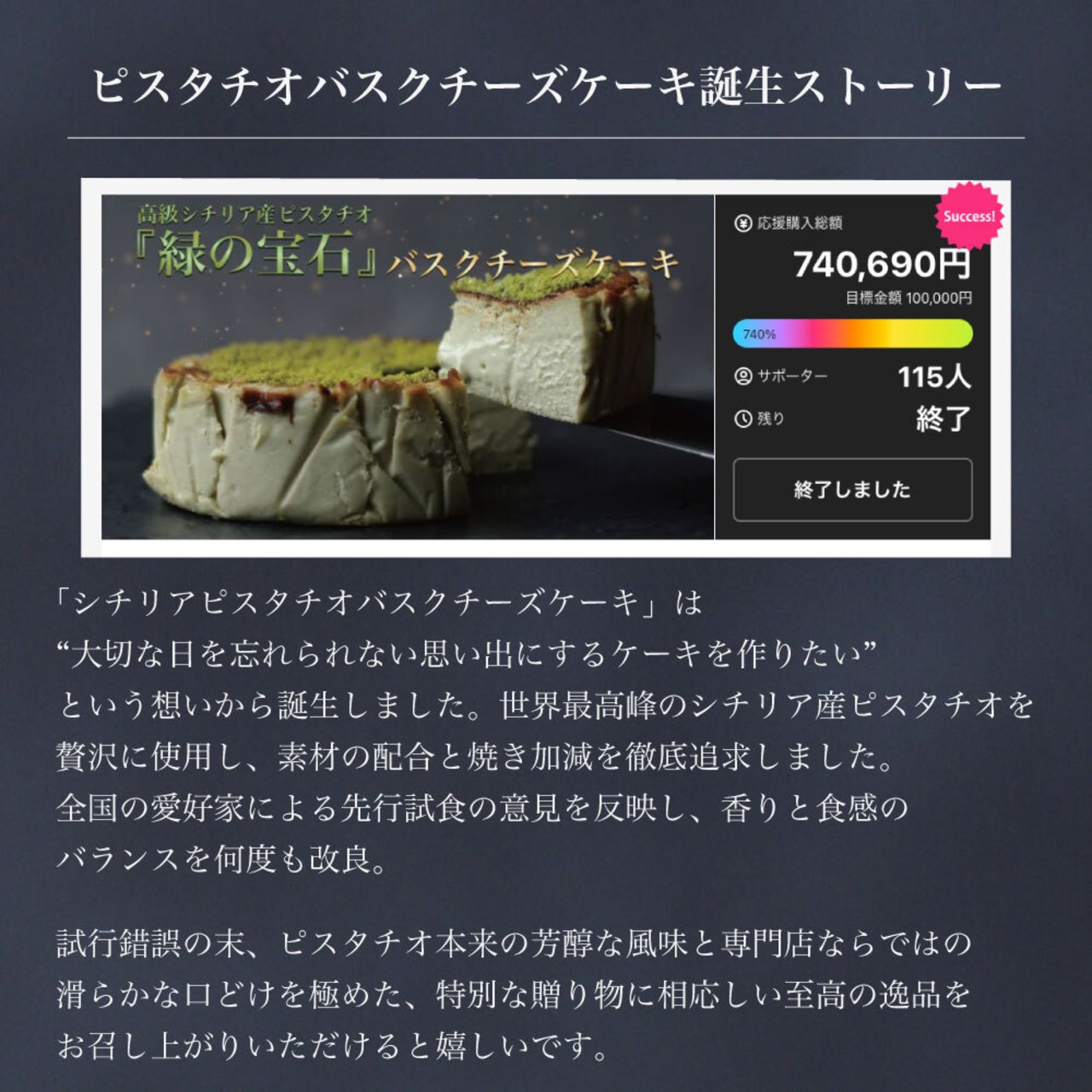 Makuakeで達成率740%を記録した「シチリアピスタチオバスクチーズケーキ」が登場。