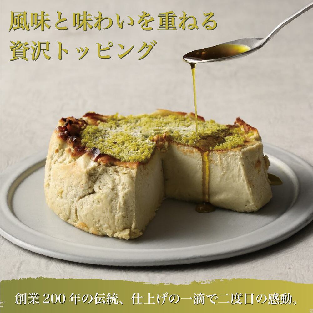 フランスの老舗〈J.ルブラン〉の石臼挽きオイルを別添。仕上げにかけることでピスタチオの香りがより一層鮮やかに立ち上がり、濃厚なチーズのコクと重なり合うことで、香りが弾けるような新しい感動体験をお届けします。