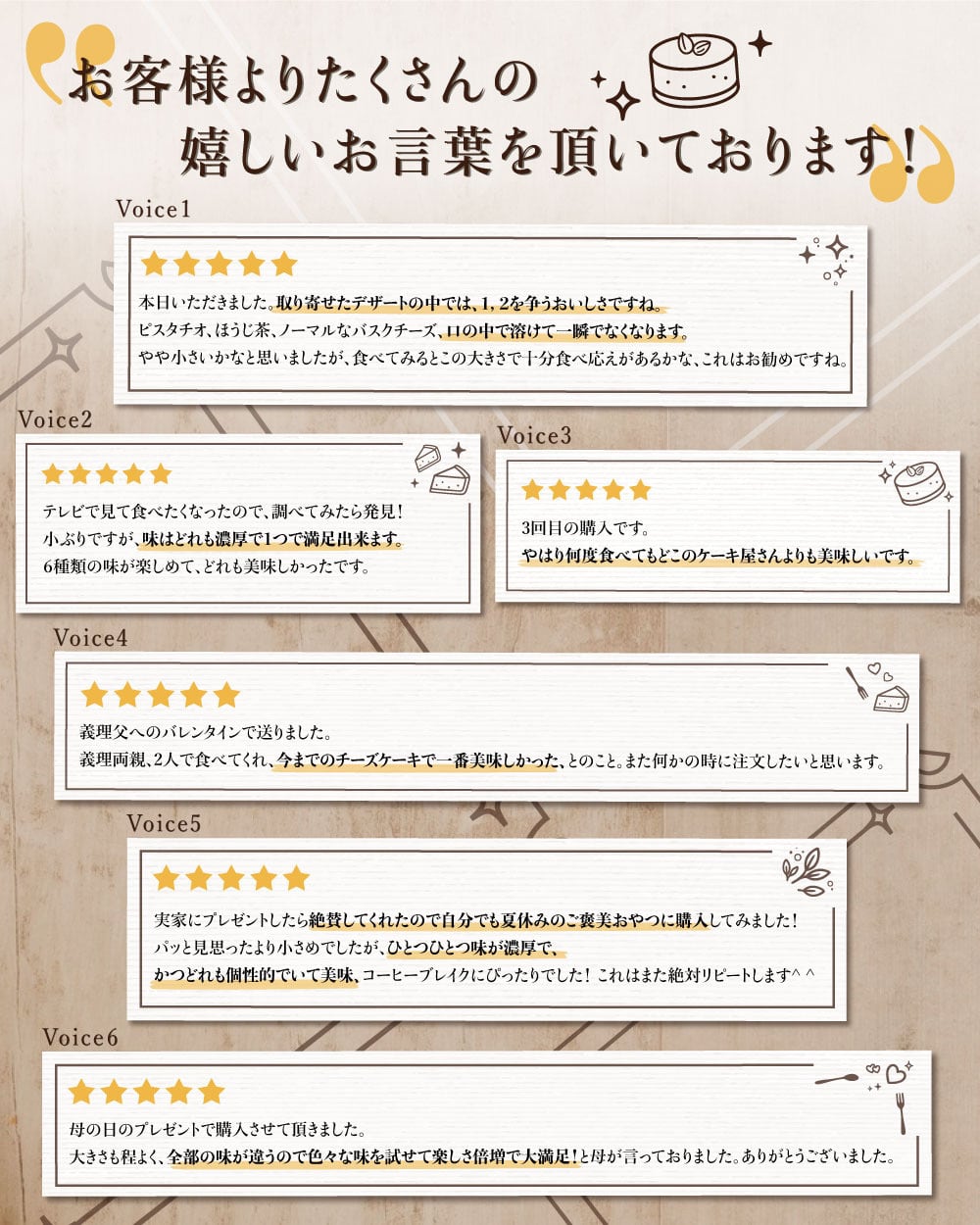 当店人気の6種のフレーバーを厳選しました。濃厚でなめらかな専門店のバスクチーズケーキを、カットサイズで手軽にお楽しみいただけます。