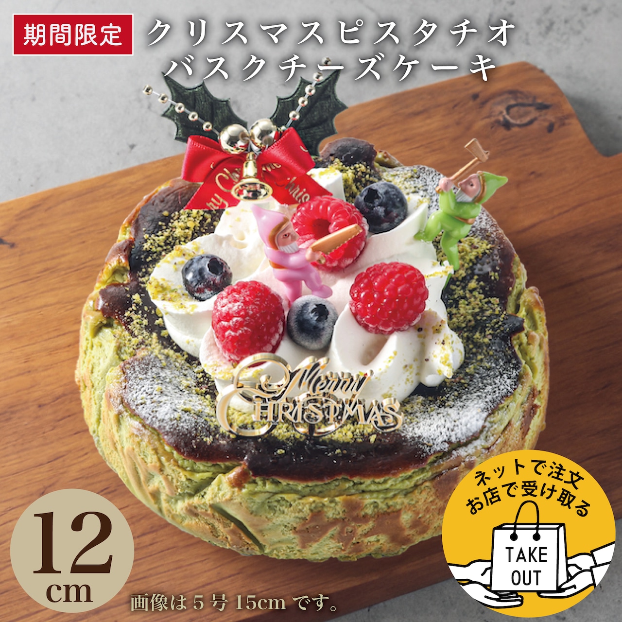 クリームチーズの濃厚な美味しさにピスタチオの風味が相性の良い人気のバスクチーズをデコレーションしたクリスマス限定デザインです。